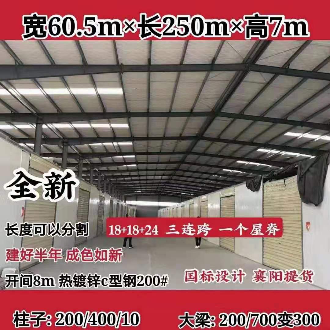 宽60.5m长250m高7m,全新长度可以分割18+18+24三连跨,一个屋脊,建好半年成色如新,开间8m热镀锌c型钢200#国标没计,襄阳提货,柱:200/400/10大梁:200/700变300